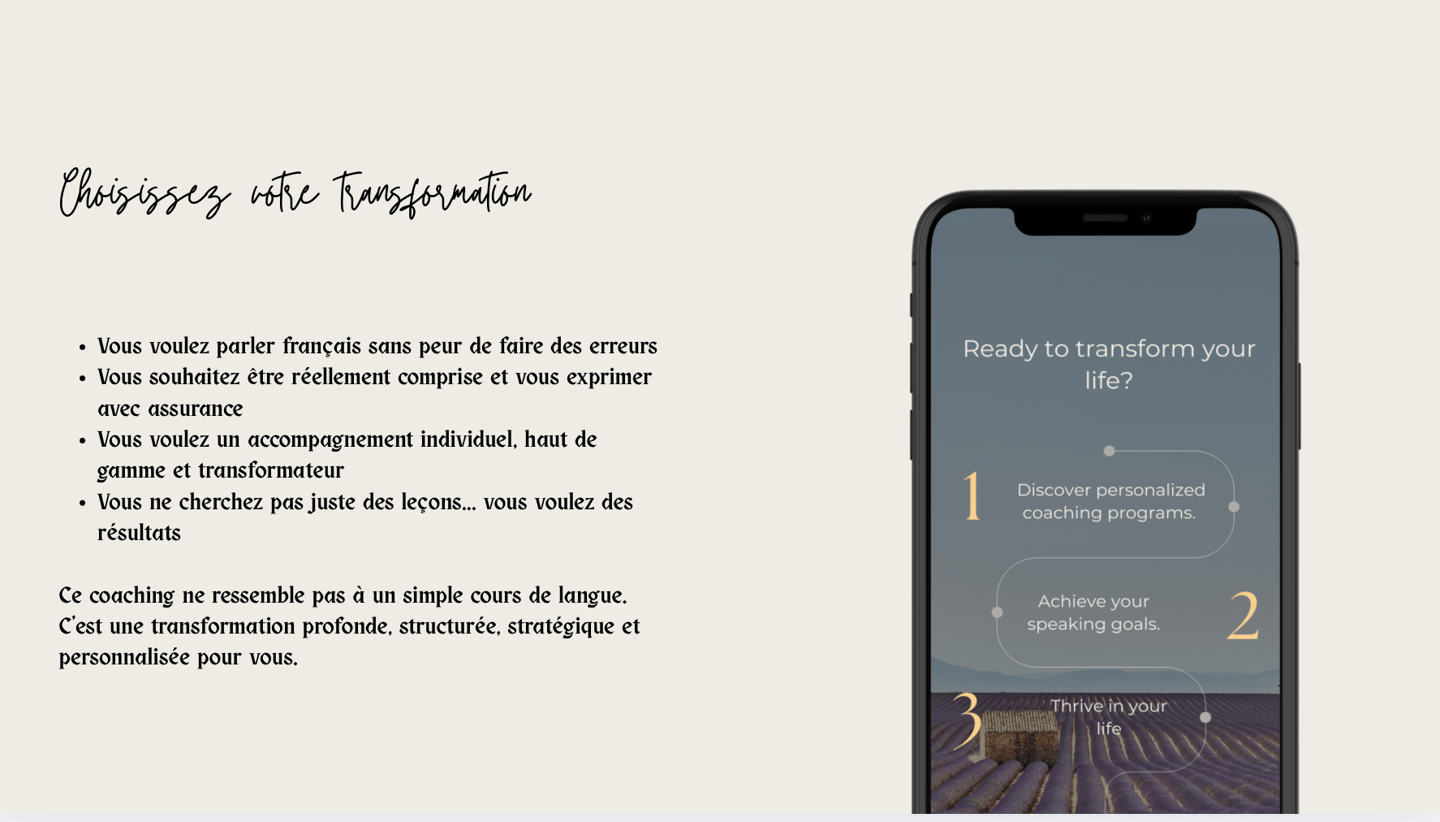 Ce coaching ne ressemble pas à un simple cours de langue. C’est une transformation profonde, structurée, stratégique et personnalisée pour vous.
